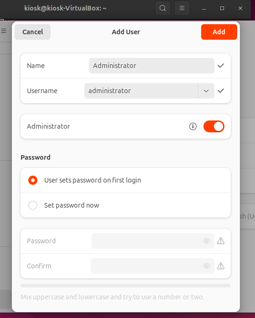 sudo apt update && sudo apt upgradeStep 3: Create an additional user called Administrator. You can do this by hitting super key --> Type settings --> System --> Users. Make sure the Administrator toggle is turned on. This account serve as a fallback to make changes after we've fully configured the kiosk and removed the admin rights for the kiosk user.
