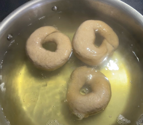 3) Adding three bagels at a time boil each bagel for 2 minutes a side. When the four minutes are up, please each bagel into the season plate and cover both sides of the bagel. When finished you can place the bagels back on your baking sheet.