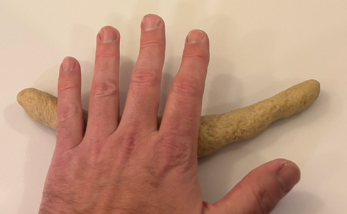 2) Roll each ball into a 30 cm (1 foot) sausage-like strip. I find it easier to apply pressure from the centre, working my way to the outside.