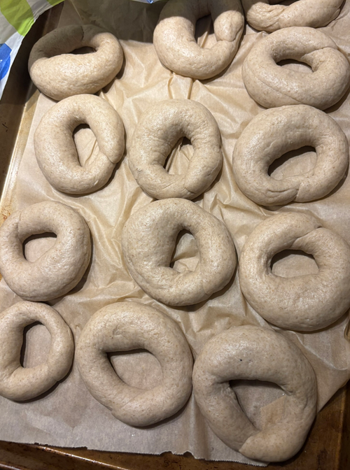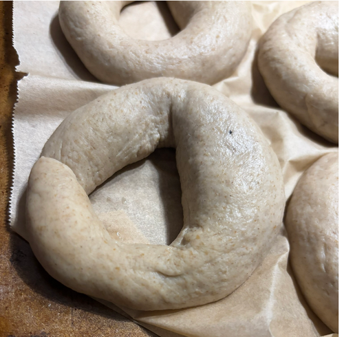 Note: It is essential to keep any bagel you are not currently working on completely covered. The dough pieces can dry out very quickly making the dough much more difficult to work with.
