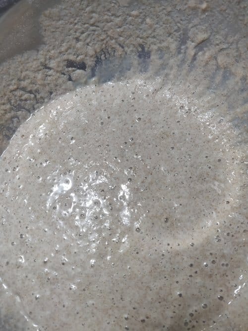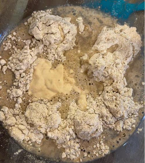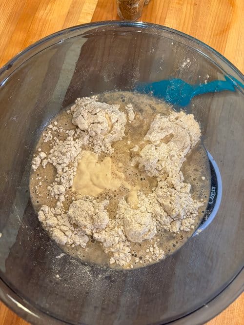 In a large bowl mix the whole wheat flour, bread flour, water and sourdough starter. Wait between 4 and 8 hours for the poolish to become bubbly. In winter I usually do this step the evening before I make the bagels.